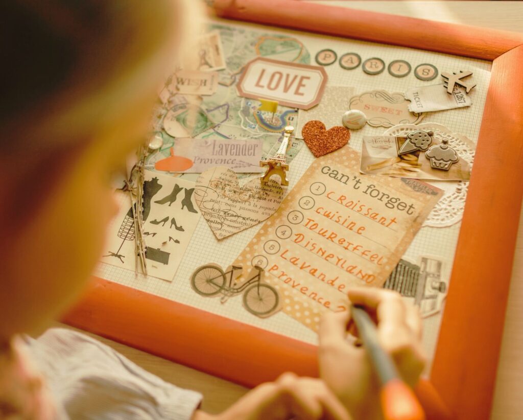 A vision board is a tool to help you visualize your goals and activate the Law of Attraction. Law of Attraction states that whatever you think about, talk about, fantasize about or give your attention to, you are going to attract more of it into your life. The best way to achieve your goals is to keep them top of mind so that you’re always looking for ways to move closer to them.